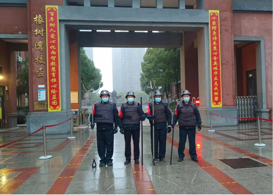 2月6日开学第一天,在庐阳区各中小学及幼儿园门口,身穿校园安保服装的保安员整齐地站在门口,守护着学生进入校园的安全。手持盾牌和防护工具的保安员们引来了同学们关注的目光。