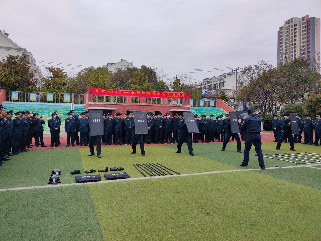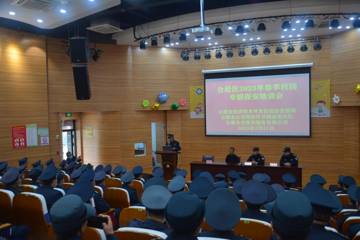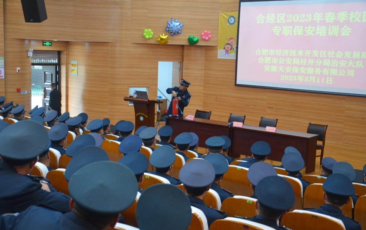 为持续加强校园安全保卫工作,更好地适应新形势下中小学、幼儿园安全防范工作需要,全面提升校园安保队伍应急处突能力,进一步向“隐患为零、事故为零”目标迈进。近日,合肥市经济技术开发区发展局、合肥市公安局经开分局治安大队,联合安徽天安保安服务有限公司开展了校园保安员安全专题培训会,全区约240名校园保安员参加培训。