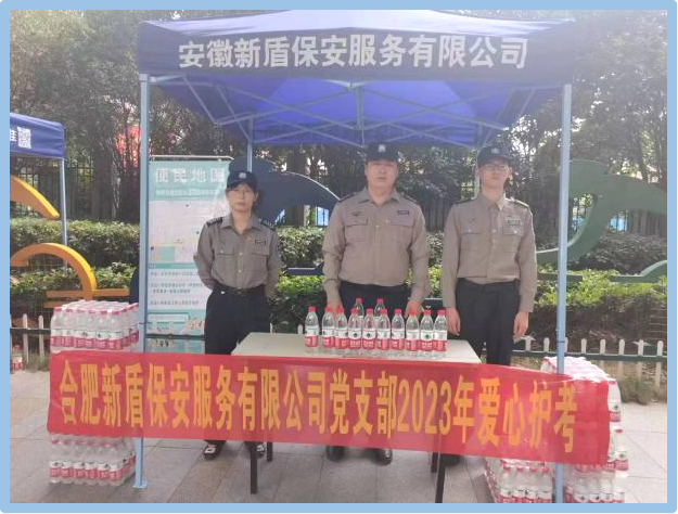 安徽新盾保安服务有限公司为确保将考生安全、准时送达考场,送考前专门对车辆进行了维护保养,驾驶员提前一天熟悉路况,并配备拥有急救经验的队员跟车,组成爱心中高考送考小组接送考生。同时,为应对各种突发情况,随车为考生准备了降温解暑的饮品及清凉油、藿香正气水等各种防暑用品。