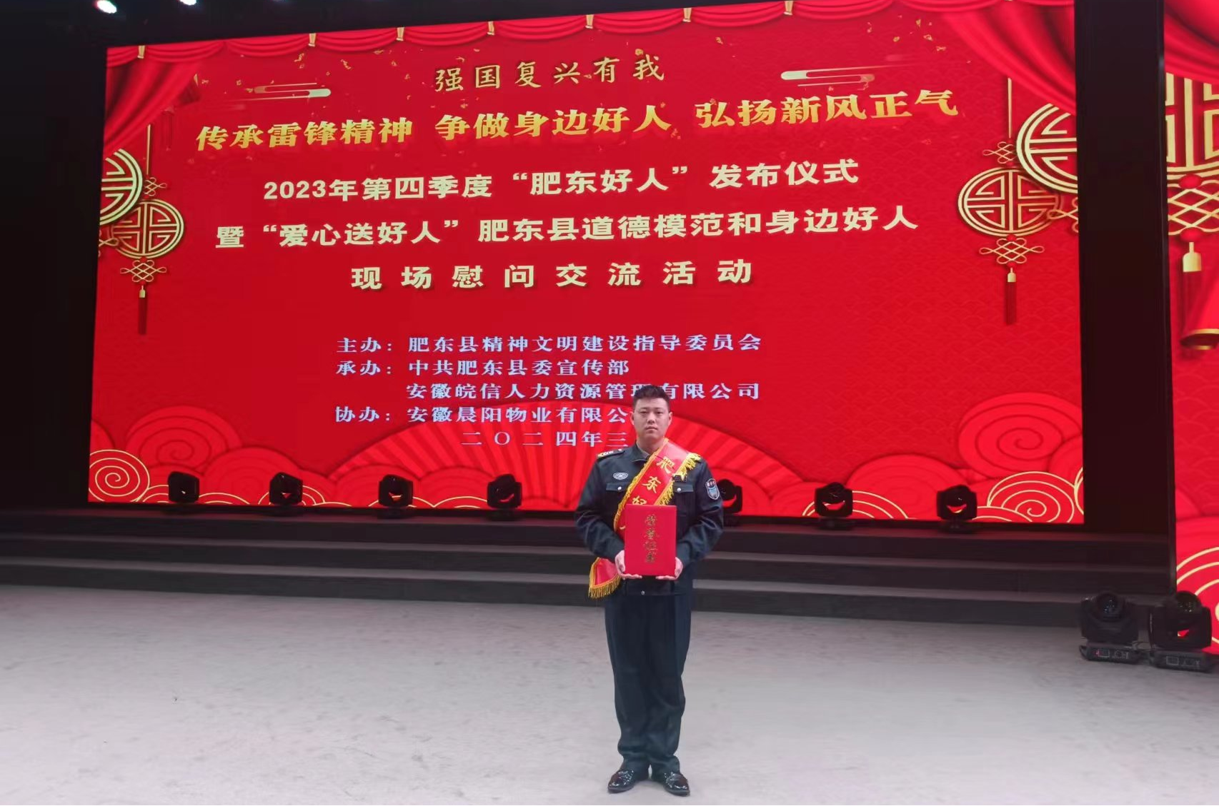 2024年3月6日,对就职于天安保安公司的丁剑同志来说,是一个意义非凡的日子——作为肥东县第四季度见义勇为类“肥东好人”入选人,参加了“肥东好人”发布仪式及现场颁奖活动,并被授予“肥东好人”荣誉证书。