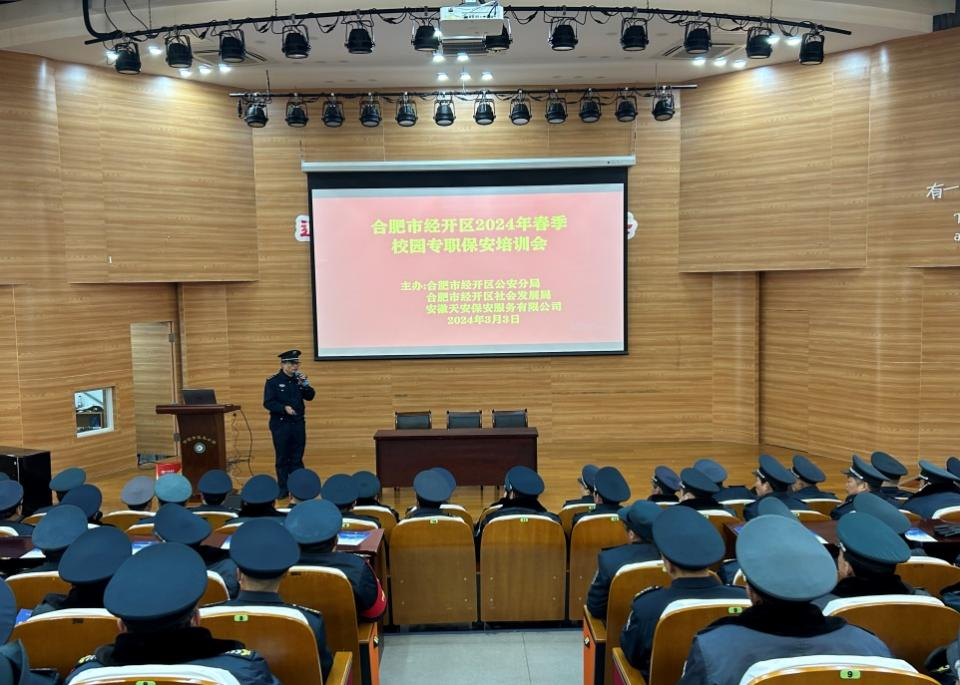 2024年3月3日上午,合肥市经济技术开发区社会发展局、合肥市公安局经开分局治安大队联合安徽天安保安服务有限公司,在合肥市莲花小学举办了合经区2024年春季校园专职保安培训,来自全区近190余名保安员参加培训。此次培训旨在有效防范校园突发伤害事件,切实保障师生安全,及时处置侵害师生安全的恶性事件,维护学校安全稳定,发挥校园保安人员在处置突发性事件的作用。