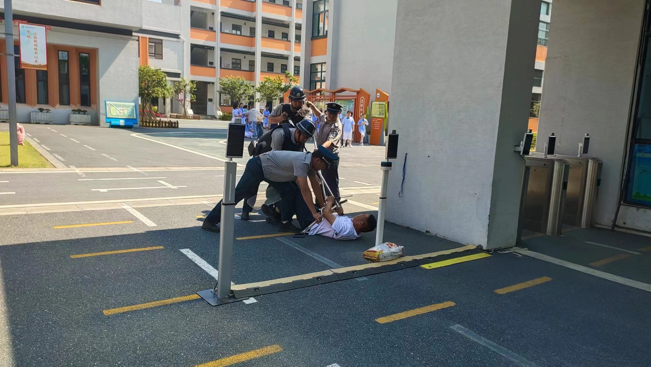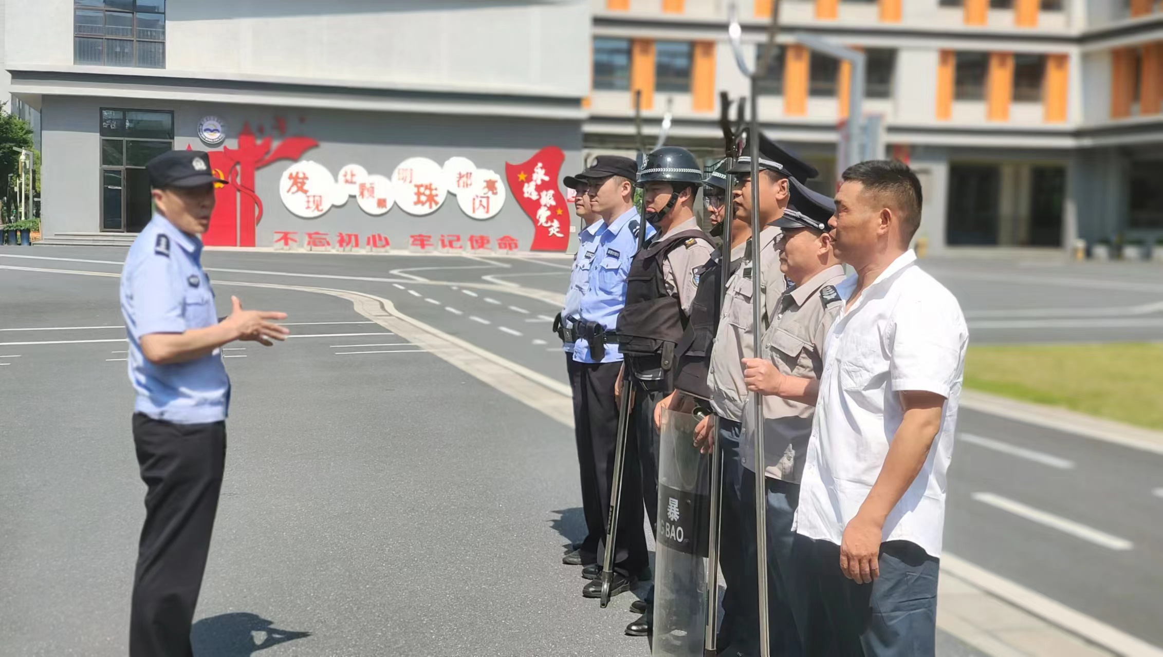 公司联合合肥市经济开发区社会发展局、合肥市公安局莲花派出所在合肥市明珠小学开展反恐应急演练。根据反恐防暴应急演练预案,民警对保安队员讲解防暴盾牌、防暴棍、防暴钢叉等器材使用方法,明确各岗位职责分工、演练方式及流程后,按照既定方案开展演练,全体参与人员认真对待、全心投入,把演练当成实战来开展,达到了预期效果。