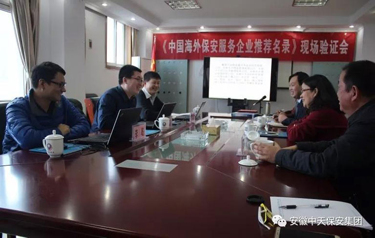 2018年1月15日,中国保安协会组织的《中国海外保安服务企业推荐名录》考察团莅临中天保安集团。中国保安协会验收组负责人郭立志,携考察组专家李东军、李乾,开展了本次验收活动;安徽省公安厅保安监管处处长陈忠红,安徽省公安厅保安监管处副调研员张正良,安徽中天保安集团董事长张传林,安徽中天保安集团办公室主任窦仁芝参加了本次验收研讨会议。