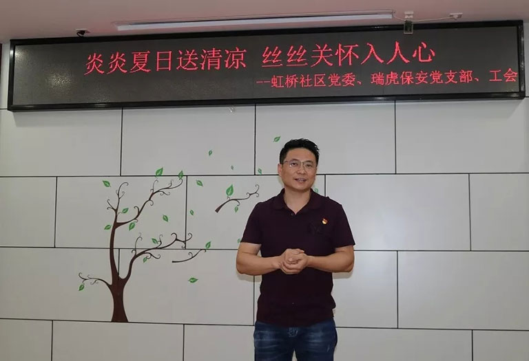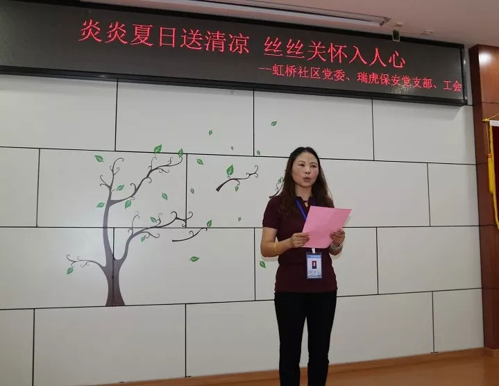 7月19日上午,瑞虎保安2019年“夏日送清凉”活动正式启动。虹桥社区党委书记焦常玲、社居委主任董群、党委副书记朱青、瑞虎保安党支部书记刘圣峰、执行董事刘贤虎、社区席庆泓、郑志丹等同志和我公司支部、工会主要成员以及一线职工代表出席启动仪式,我公司工会主席王静主持启动仪式。
