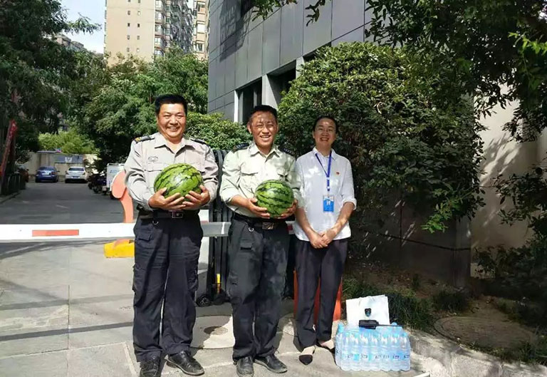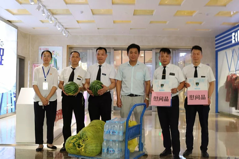 公司执行董事刘贤虎、运营部、行政部一行前往各项目慰问一线职工。为在高温酷暑中坚守岗位的一线员工送去清凉解暑的慰问品,向所有为公司稳步前行付出辛勤汗水的广大员工表示感谢,并鼓励大家在酷暑中坚持做好安全保卫工作,员工们纷纷表示一定会坚守自己的岗位,以最好的状态投入到工作当中。