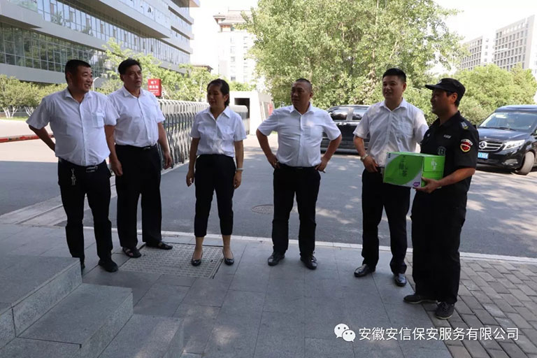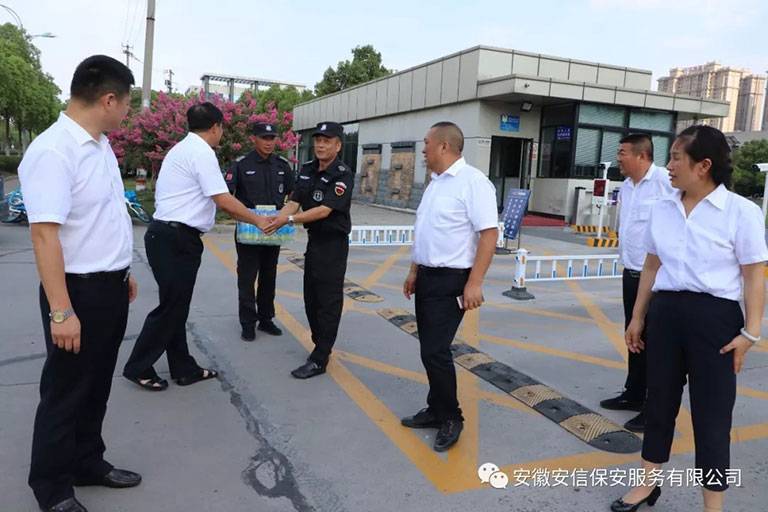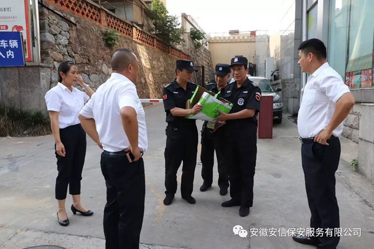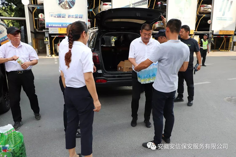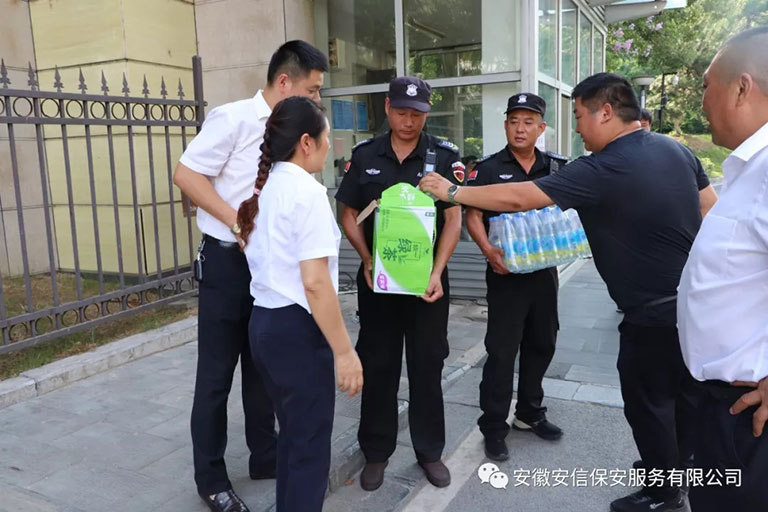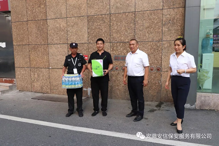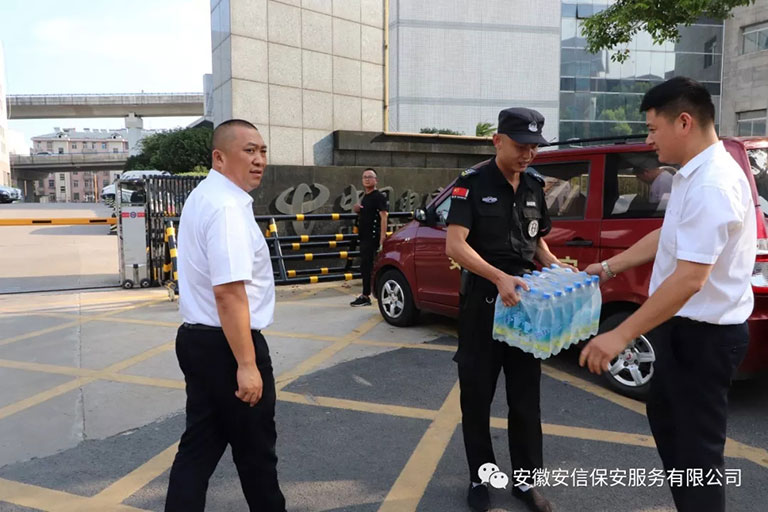 大暑过后,合肥连日高温,气温节节攀升。广大保安员顶烈日、冒酷暑,积极奋战在保安工作第一线,用实际行动展现了安信保安的良好形象和专业素质。安信公司高度重视对一线保安员的防暑降温工作,于2019年7月26日开展了“酷暑送清凉”活动。公司董事长谢勇带领公司工会主席及主要管理人员为奋战在高温第一线的员工送去了清凉饮料、藿香正气液等防暑降温用品。
