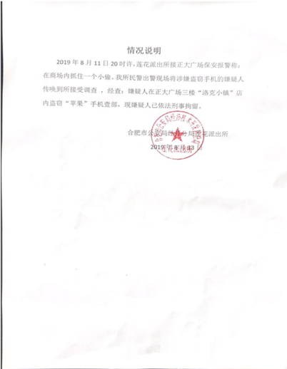 2019年8月11日20点左右,合肥市正大广场物业群发了一个截图与小视频,里面内容是小偷盗窃手机,负责正大广场项目的金经理立马提高警惕把视频和截图发到安保工作群,让队员严加巡查,注意该名小偷,晚20点40分左右,振远特卫保安集团驻合肥市正大广场保安队员曲斌在商场外停放非机动车处发现一名可疑人员神色慌张,行为怪异。经过临近仔细辨认后发现确为在商场作案的小偷,并迅速通过对讲机呼叫现场安保负责人金经理,迅速控制住嫌疑人,并报警移送给公安机关。
