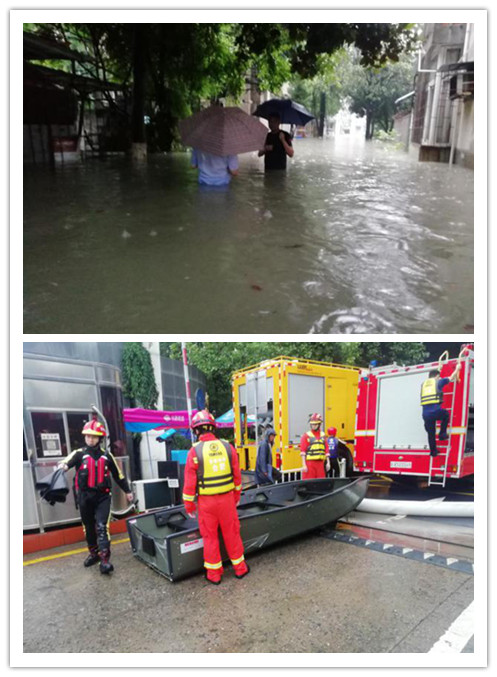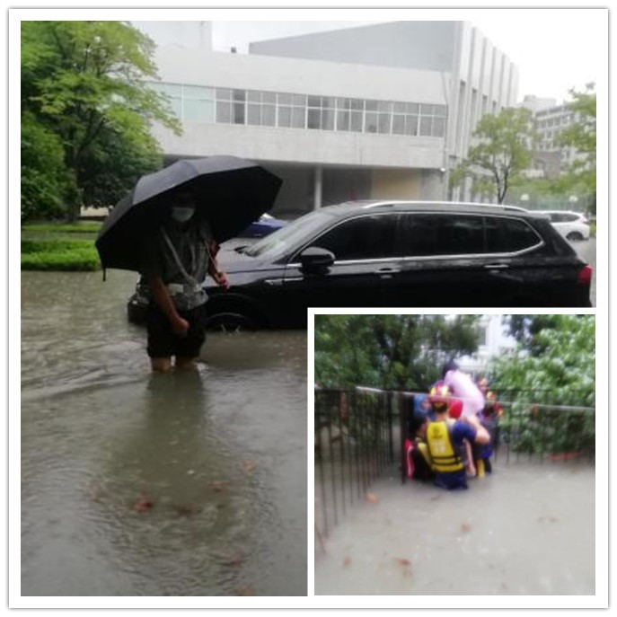18日凌晨5:00左右,强降雨不断,驻校神之盾保安队在校区重点区域防汛巡查,突然在教职工宿舍区,地下积水倒灌,低洼处积水迅速高升。险情就是命令,积极响应暴雨极端天气应急处置方案,向上级报告实时汛情,并及时通知停在区域的车主,免受财产的损失。随着水位的不断升高,队员们不顾自身的安危,趟着深水,分别查看有没有困在家中需要救护的人员。经联系119冲锋舟救援,在保安队员们协助下,从宿舍楼内救出13名老人及儿童。119救援队完工后离开校区时,雨还在下,神之盾保安队员仍坚守在现场指挥,确保人员和车辆行人的安全,直到积水退去。