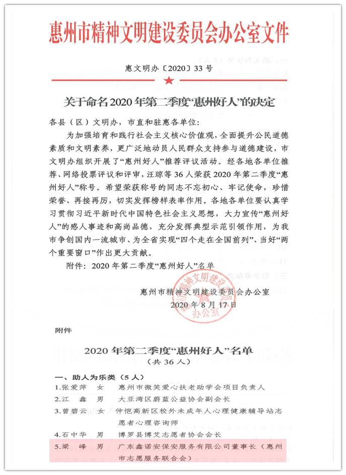 经各地各单位推荐、网络投票评议和评审,8月17日,惠州市精神文明建设委员会办公室发布文件《关于命名2020年第二季度“惠州好人”的决定》,36人荣获2020年第二季度“惠州好人”称号,其中,我会常务理事梁峰被评为助人为乐类“惠州好人”。