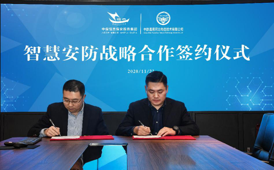 2020年11月23日,中保恒杰保安服务集团与中防通用河北电信技术有限公司在安徽合肥举行了智慧安防战略合作签约仪式。中保恒杰战略规划部总监张建斌、中防通用河北电信技术有限公司长三角大区总经理聂广华等人出席了此次签约仪式。