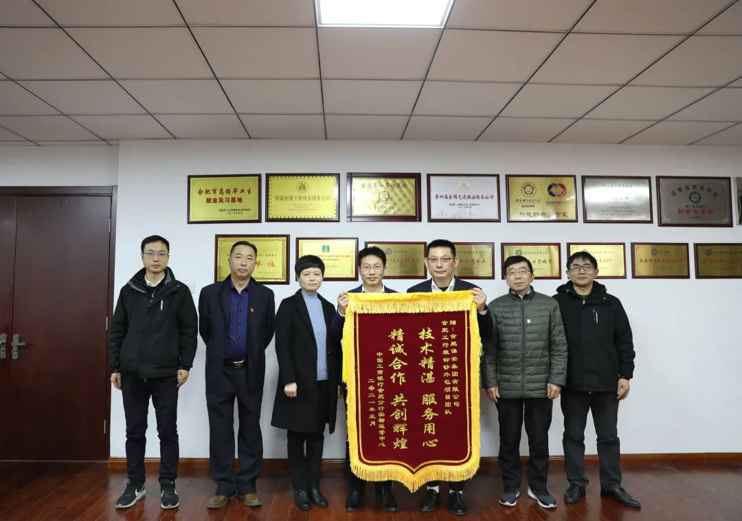 “技术精湛 服务用心,精诚合作 共创辉煌”。3月11日上午,中国工商银行合肥分行实物中心(以下简称工行)总经理王胜、副总经理高云、办公室主任张建新将一面锦旗送到了合肥保安集团。保安集团副总经理李志斌,安徽建金总经理朱文娟等热情接待了工行领导一行。