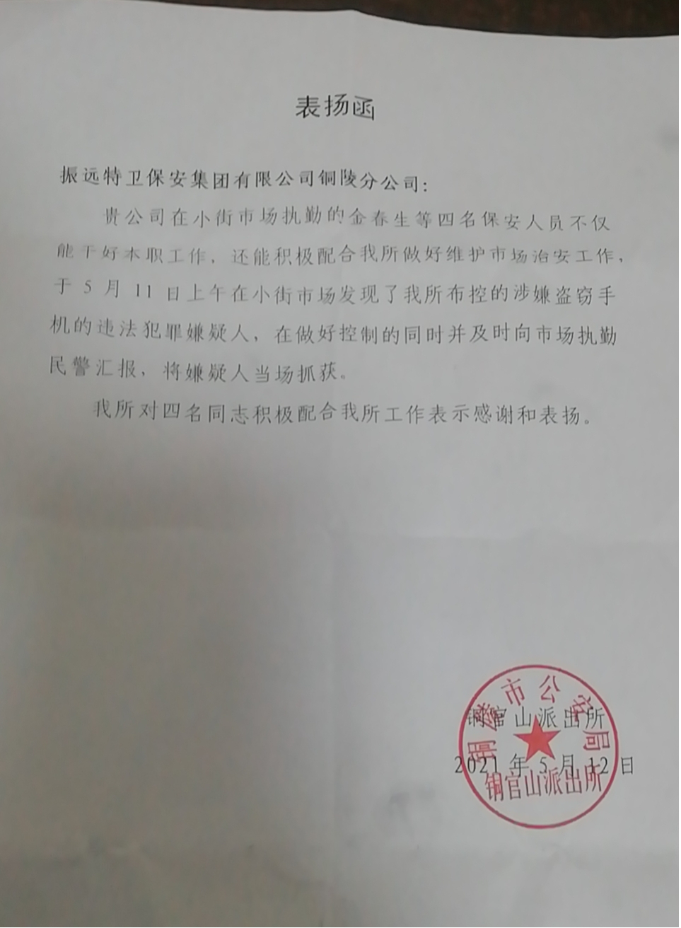 2021年5月11日振远特卫保安集团铜陵分公司驻项目金春生等四名保安员在小街市场巡查时发现一名形迹可疑人员,经核实,该男子为铜关山派出所布控的涉嫌盗窃手机的违法犯罪嫌疑人,金春生等四名保安员在做好控制的同时并及时向市场值勤民警汇报,将嫌疑人当场抓获。次日,铜关山派出所为振远特卫保安集团铜陵分公司给予表扬函一封,以示鼓励。来自公安机关的表扬就是对我们保安行业服务的充分肯定。