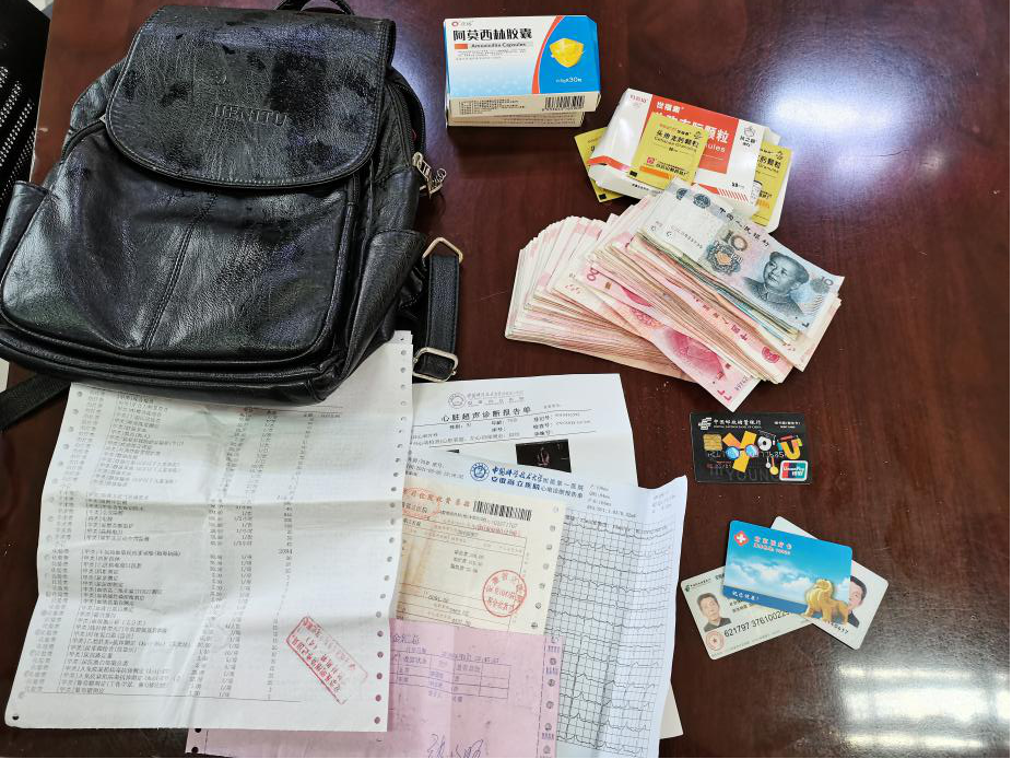 到了办公室后,通过仔细清点发现有现金1万6千余元,还有身份证、社保卡、银行卡、两家医院的缴费票据以及一张手机缴费的凭据。通过手机缴费凭据上留的电话号码,公司大队长随即电话联系寻找失主,终于联系到了失主的外孙女张女士。