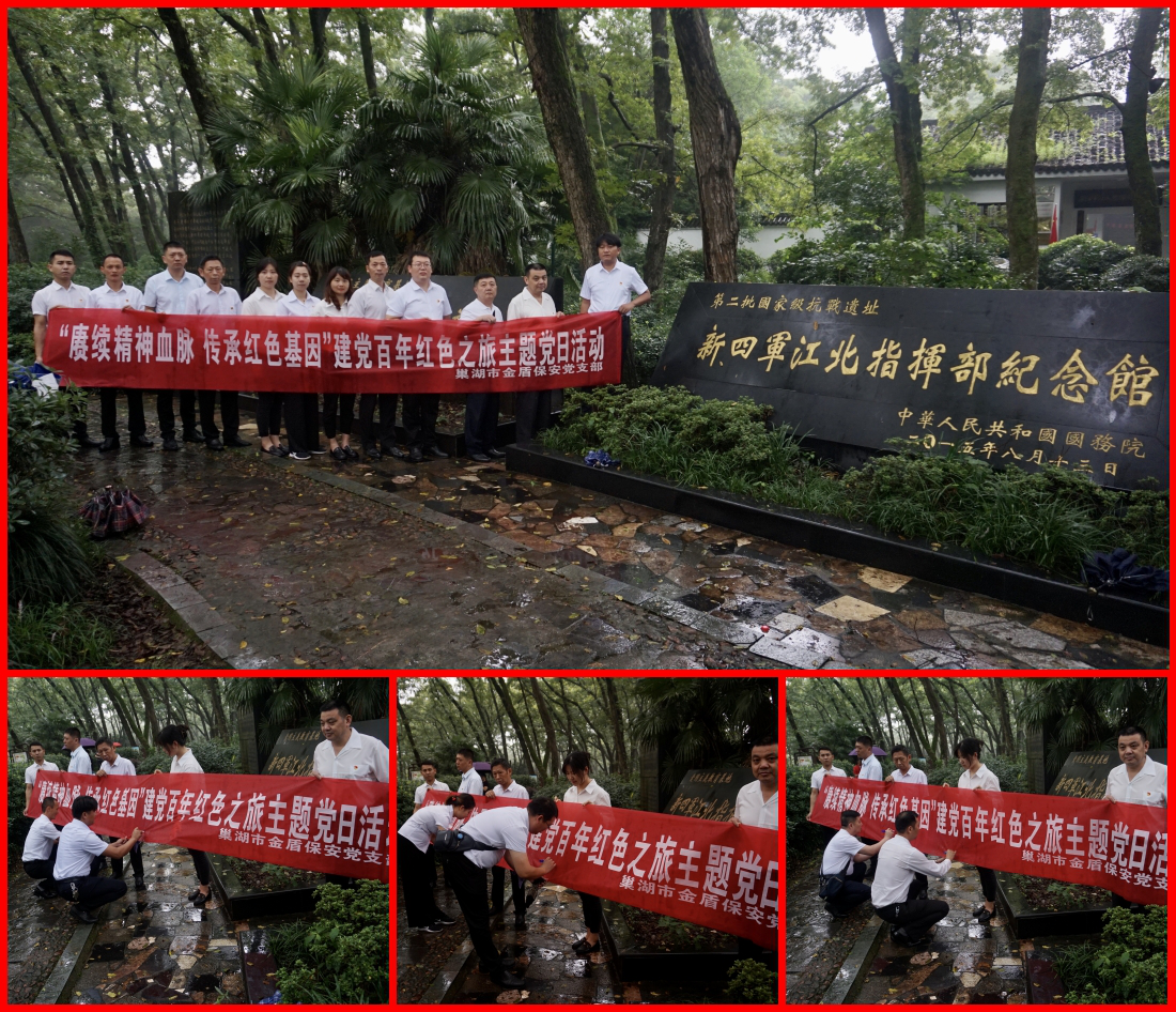 时值中国共产党建党百年之际,为进一步学习贯彻习近平新时代中国特色社会主义思想和党的十九大精神,2021年6月19日,巢湖市金盾保安服务有限公司党支部带领公司十三名党员代表,前往庐江新四军江北指挥部纪念馆红色教育基地,开展“赓续精神血脉,传承红色基因”建党百年红色之旅主题党日活动,接受革命传统教育,教育引导广大党员不忘初心,继续前进。
