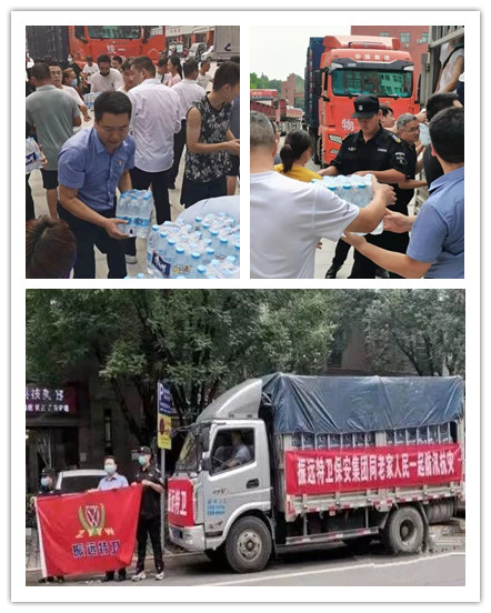 7月23日一大早该公司通过河南驻京办事处联系郑州市金水区红十字会,该公司领导亲临现场部署,迅速筹集500箱矿泉水,赶赴郑州捐赠。郑州市金水区红十字会和郑州市七十六中学的工作人员接收捐赠物资后,对振远特卫保安集团有限公司在危难之时慷慨相助的义举表示感谢。他们表示一定会尽快把捐赠物资分拨到最需要的人手中,绝不辜负振远特卫保安集团的一片爱心。