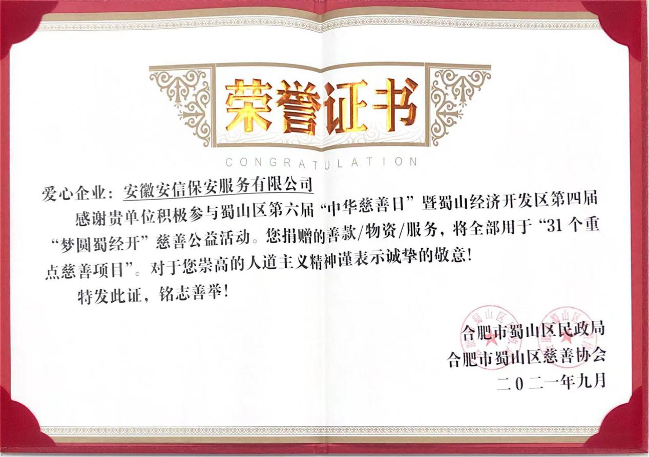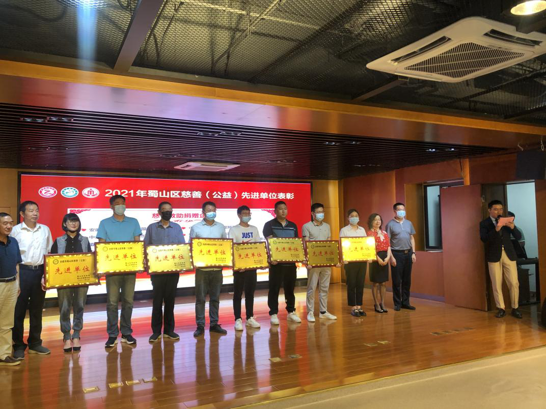 项目认领结束后,蜀山区民政局、区慈善协会对2021年以来为蜀山区慈善事业作出突出贡献的单位和个人进行了表彰。该公司荣获蜀山区民政局、蜀山区慈善协会颁发的2021年度合肥市蜀山区“慈善(公益)先进单位”荣誉称号。