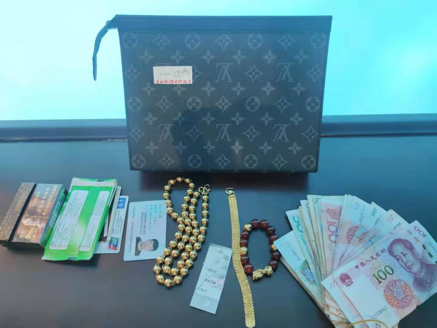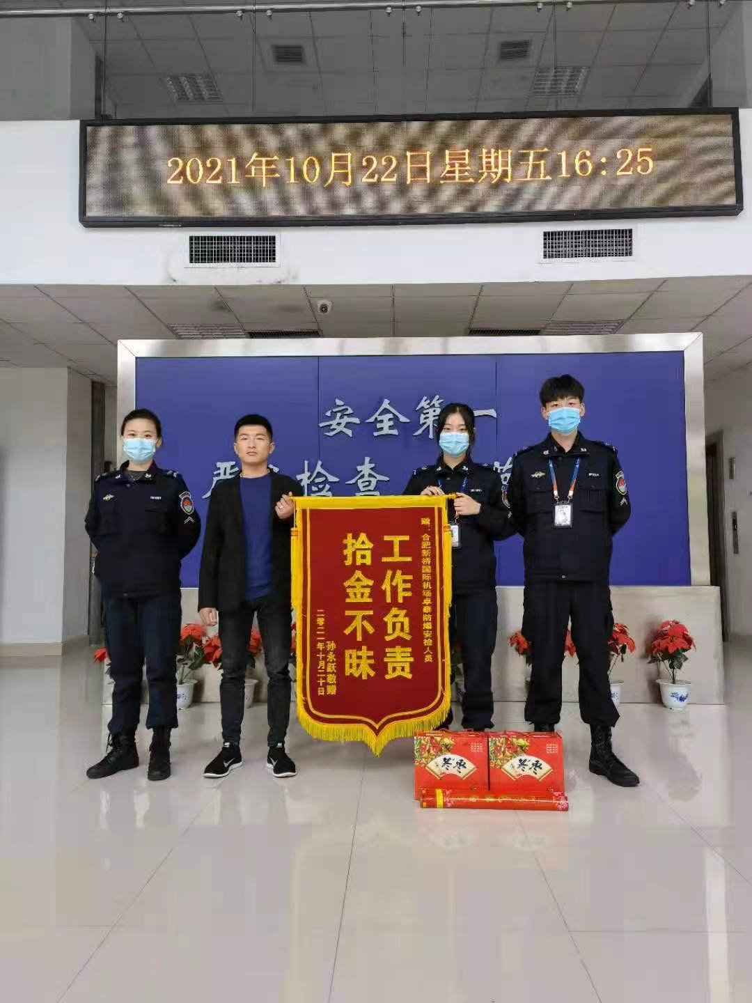 2021年10月20下午4:30,卓泰保安公司合肥新桥机场防爆安检员张紫薇在工作中拾到旅客遗失LV包1个,内有现金1640元,金玉手链2条,金项链1条,银行卡数张及身份证,总价值约6万元。张紫薇立即交给失物招领处,并通过失物招领处得到丢失物品旅客电话。晚8:30,旅客匆匆返回机场认领物品,当即拿出500元现金表示感谢,被该司员工婉言谢绝。10月22日下午该旅客带着锦旗再次来到现场对该司工作人员表达感激之情。
