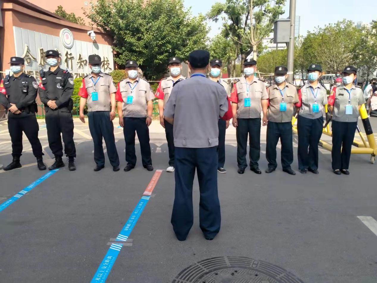 为保障高考顺利进行,安海保安公司各中小学项目点,密切配合教育主管部门、公安机关及各考点学校,细化量化工作任务,开展列队培训,编制布岗地图,明确职责、细化措施,全力做好高考期间安全风险隐患排查、现场安保护卫、交通指引、停车管理、疫情防控等安保工作,确保高考万无一失。