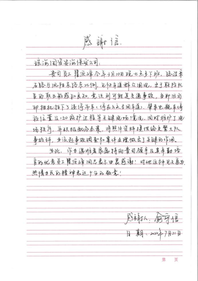 7月22日,事故遇难者家属特意向安徽安海保安服务有限责任公司送来锦旗和感谢信,并表示:非常感谢瞿顶峰同志见义勇为的行为,拍摄了现场关键材料,才让案件有了公正的结果。真的非常感谢您!感谢您们公司!