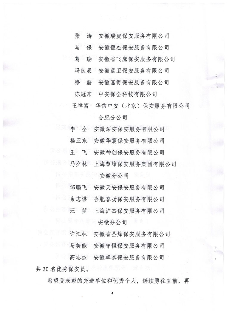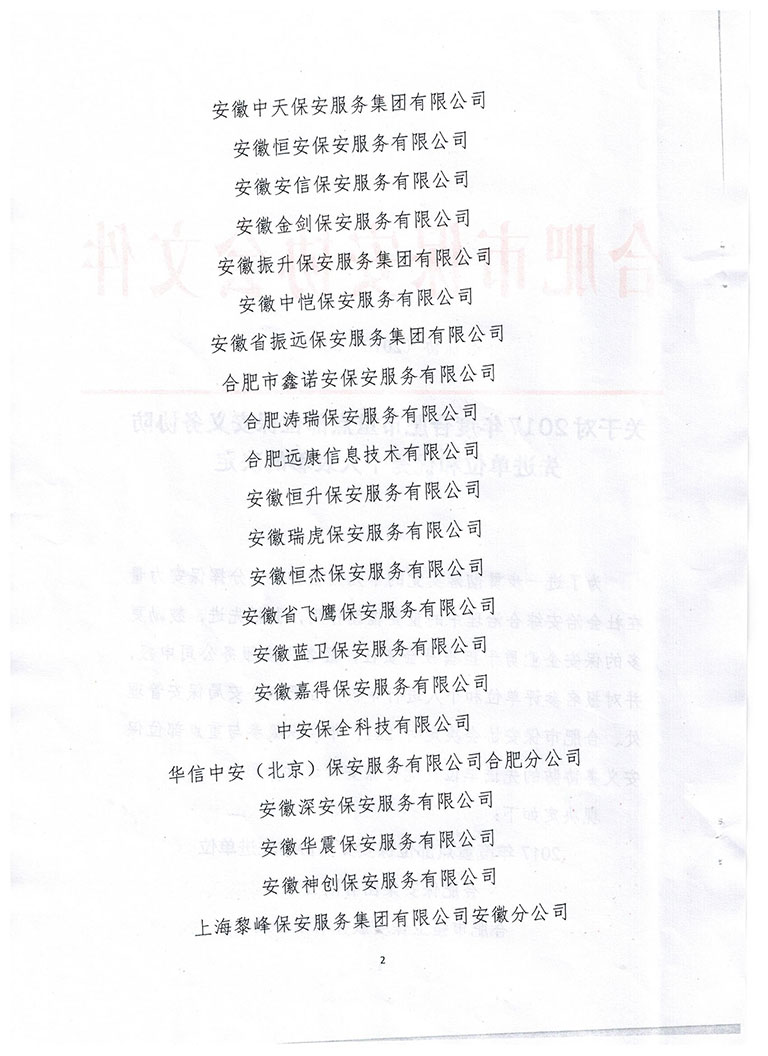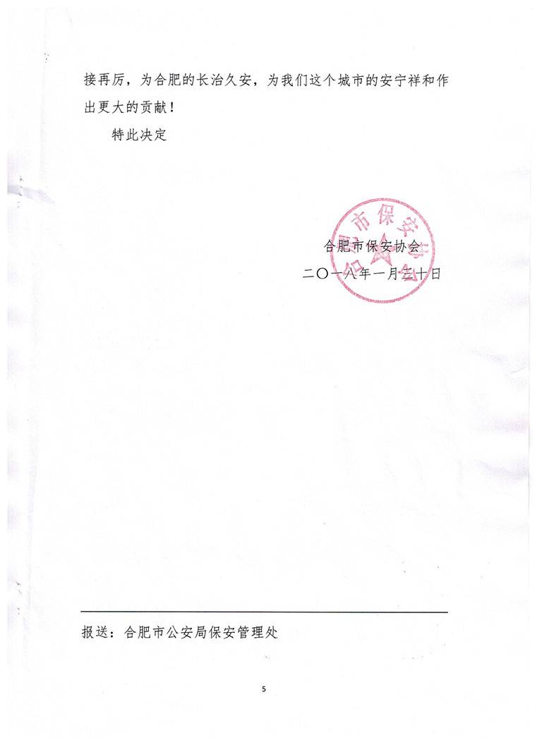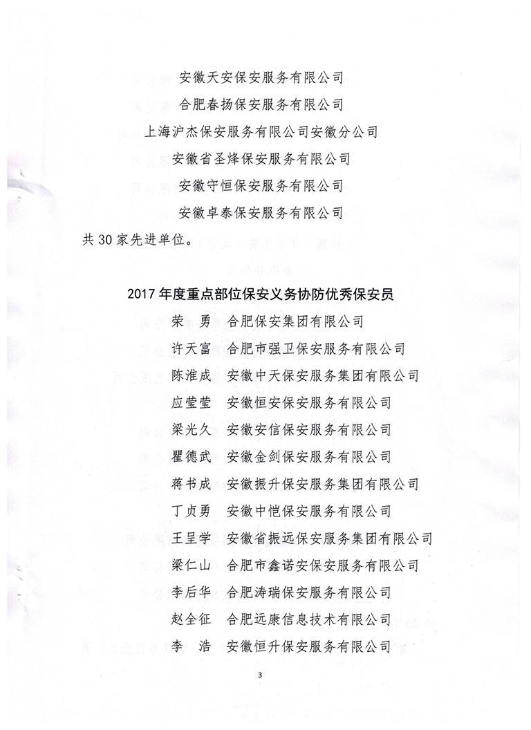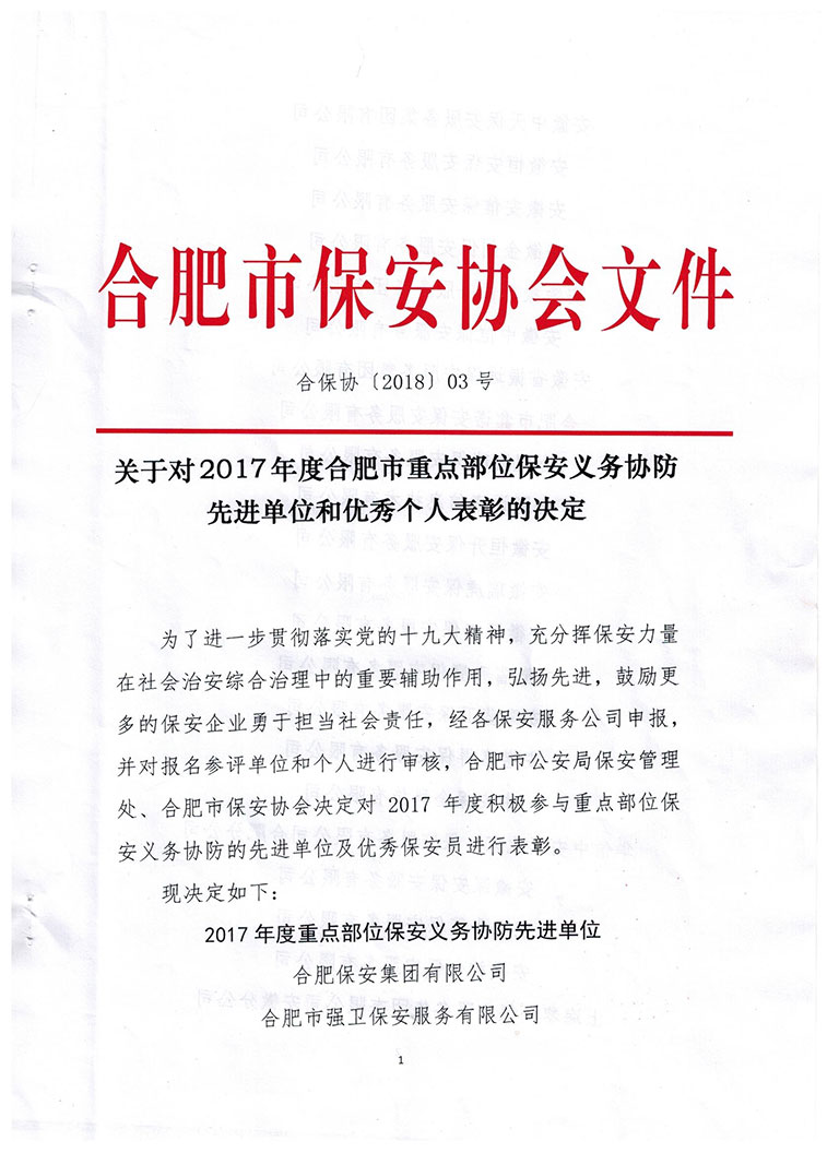 关于对2017年度合肥市重点部位保安义务协防 先进单位和优秀个人表彰的决定