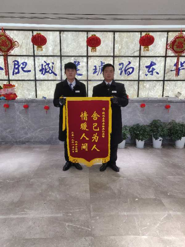 事情还要从2019年1月1日说起。元旦当晚振远特卫保安集团驻合肥城建琥珀物业东华府保安主管刘亚与徐志昂同志下班后回宿舍途中路径王岗地铁站,正在十字路口等红绿灯时,一位母亲带着一大概五六岁的儿童过马路,这时一辆轿车由北向南抢黄灯快速通过,当时轿车司机在到十字路口中央处时狂按喇叭但并未减速往前行驶,这时小朋友可能因为司机按喇叭的缘故收到了惊吓挣脱了他妈妈的手从斑马线位置往西跑,情况紧急,刘亚和徐志昂迅速跑上去将孩子扑倒护在怀里,由于轿依旧被撞倒在地,此时小孩的妈妈才反应过来并打了报警电话,刘亚同志和徐志昂同志确认孩子没有受伤后才放心的离开了现场,因危机时刻扑上去救小孩时,刘亚车惯性较大,司机虽然采取了急刹车,刘亚与徐志昂却佩戴的工号牌不小心遗落在现场,被孩子家长捡到,第二天便赶到刘亚与徐志昂工作地点送来锦旗表示感谢!