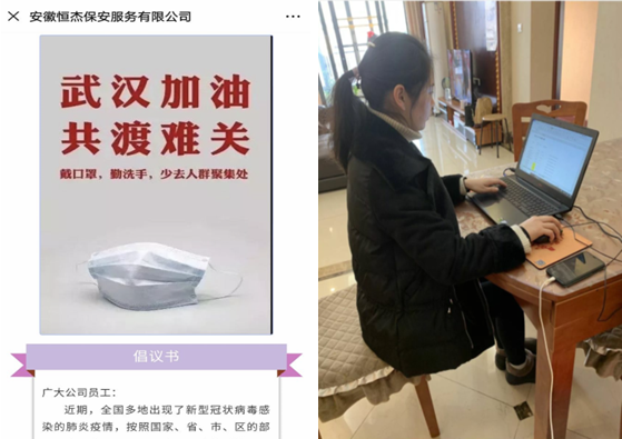 为了抓好疫情防范工作,恒杰保安公司成立了新型冠状病毒感染的肺炎疫情防控工作领导小组,公司董事长征红蔓任组长。公司在1月27日发布《倡议书》,要求员工个人和项目加强防范意识,并遵守安徽省人民政府办公厅的通知延长假期,员工每日报备个人情况,开展网上办公。