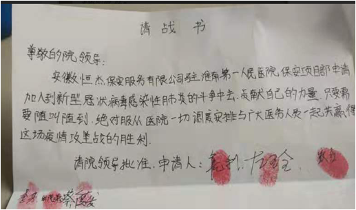 恒杰保安公司驻淮南市第一人民医院项目队员面对疫情放弃休假团聚,坚守岗位,毫不退缩,主动请缨加入到新型冠状病毒感染性肺炎的斗争中去,贡献自己的力量,自发写下一份请战书,“我们志愿加入抗击新型冠状病毒肺炎的工作,为赢得抗击病毒战斗的胜利奉献自己的一份微薄的力量。”他们用自己的微光传递着热量,为了捍卫人民健康和安全,他们逆风而行。