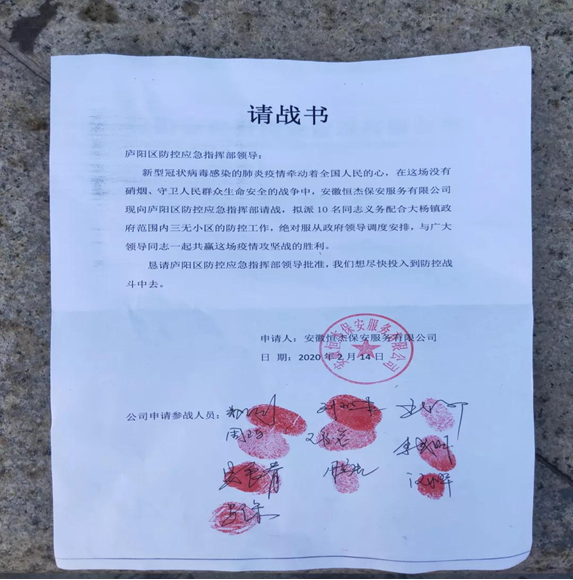 2月14日,恒杰保安公司接到庐阳区防控应急指挥部志愿服务任务后,向全体党员和青年干部发出倡议,动员公司全体党员和青年干部投身疫情防控志愿服务工作。一个个“我报名”“我请缨”“随时待命”出现在通知下方,不到15分钟,全体中层干部组成了疫情防控志愿服务队,建立了“恒杰保安志愿服务群”,并第一时间与大杨镇政府对接联系,义务配合大杨镇政府范围内“三无小区”的疫情防控工作。