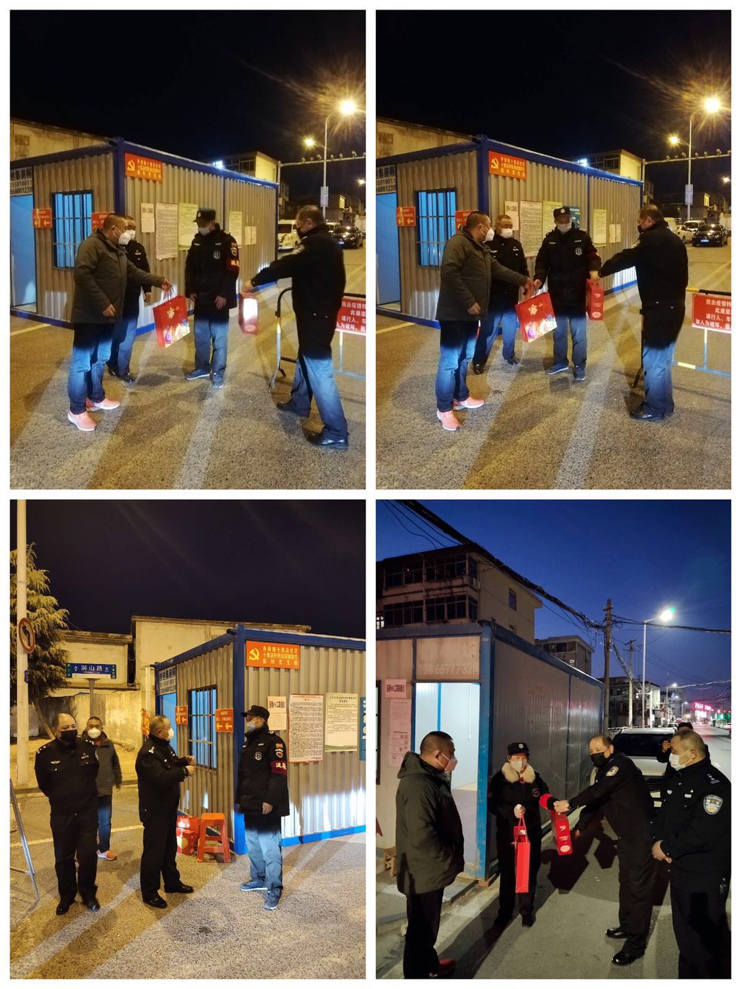 2月20日晚,在安信公司谢勇总经理陪同下,蜀山公安分局治安大队费健、申利同志,对按市防疫指挥部指令,在蜀山区十里店社区安信公司责任区7个(三无小区)执勤点的保安员在岗在位、履职尽责情况进行慰问督察并给奋战在抗疫一线的保安员送上慰问品,对保安员舍小家为大家的无私奉献精神表示感谢,同时要求安信公司做好所有队员后勤保障工作。