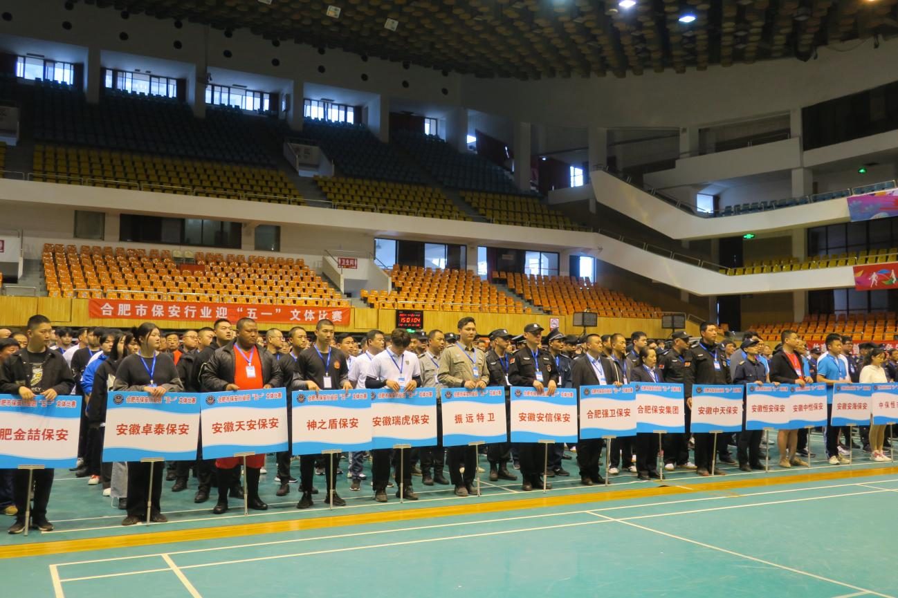 2023年4月25日下午,合肥市保安行业迎“五一”文体比赛在安徽省体育馆如期举行。全市38支参赛队伍,328名参赛人员同台竞技。举办此项赛事旨在丰富保安队伍文化生活,促进保安从业人员体能提升,增强团队协作能力和集体荣誉感。市公安局治安警察支队、保安管理处领导,以及协会班子成员、全体参赛选手和裁判员代表参加开幕式。市公安局治安警察支队副支队长蒯家球致辞并宣布比赛开始。