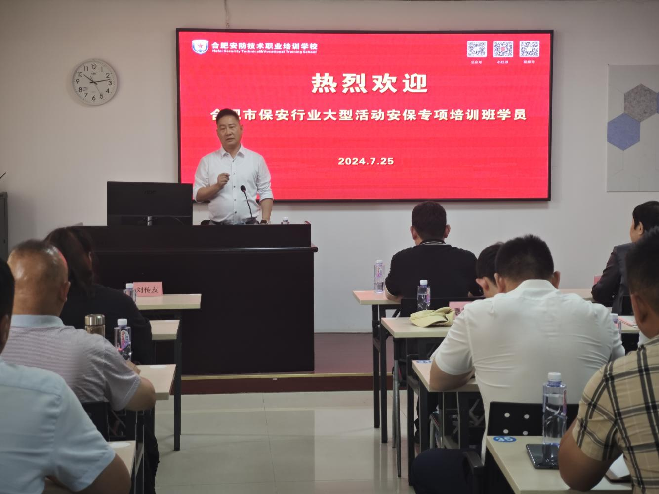 上海黎峰保安服务集团董事长刘传友应邀授课。他结合该集团大型活动组织开展视频、相关案例,从典型案例展示、安保方案制作、指挥体系与工作部署等方面分享了大型活动安保方案编制、大型活动安保管理经验。受到了合肥市保安监管部门负责同志及参训人员的一致好评。