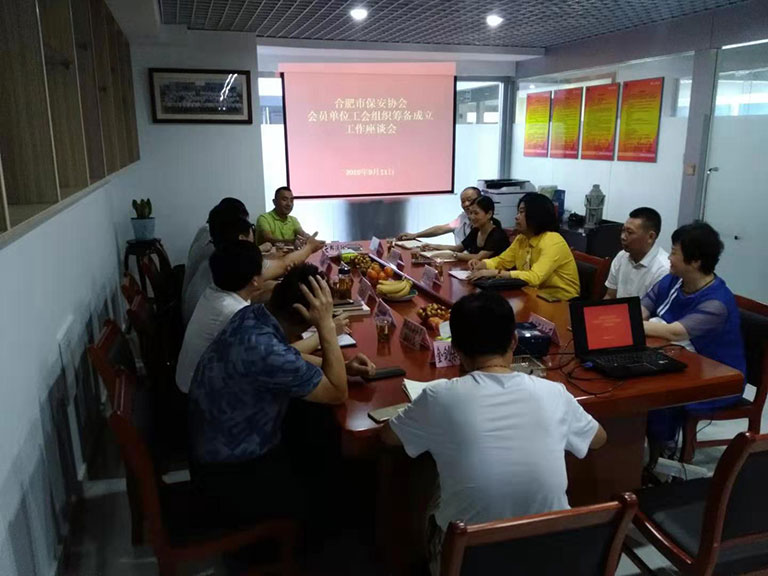 为了积极响应全总关于推进八大员入会的通知精神,帮助会员单位了解基层工会组建工作相关政策,掌握筹备建会的各项流程,9月11日下午,乐发500在副会长单位合肥強卫保安公司召开专题座谈会。会议特邀了合肥市总工会基层工作部部长卢伟、副部长周卫华对基层工会组建工作进行指导与讲授。合肥强卫、安徽金剑、安徽中恺、盛泉金融、安徽圣峰、安徽扬军、安徽保锦、安徽宏辉、云邦消防学校等九家会员单位负责人、合肥新站管委会工会办公室主任黄军、合肥新站公安分局治安大队副大队长王斌参加座谈。