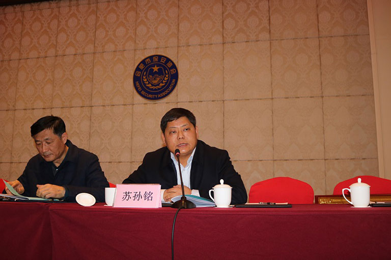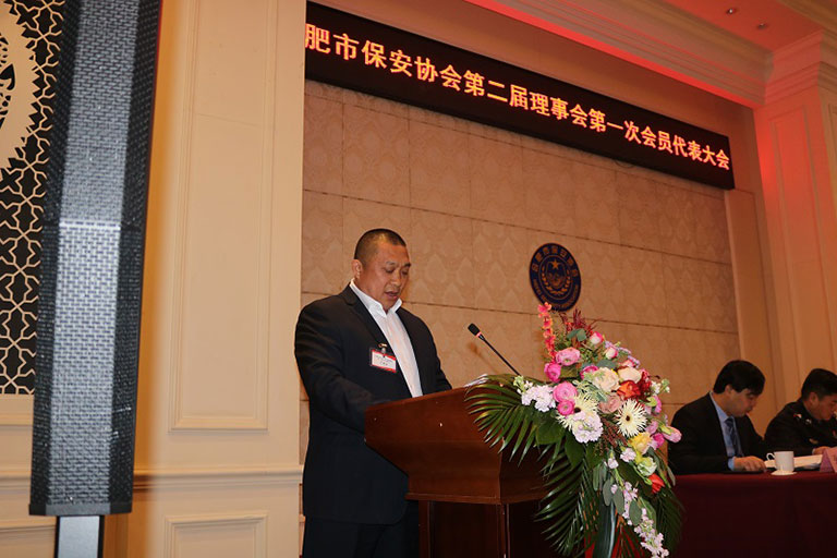 新任会长苏孙铭代表新一届理事会讲话;他首先感谢合肥市民政局对保安行业协会的支持与帮助,感谢合肥市公安局治安支队和保安管理处一直以来对协会工作的重视、关心和指导。同时更感谢全体会员对他的信任,感谢公安监管部门给予的重托与期待。