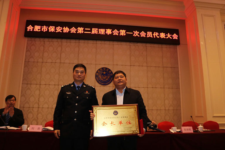 合肥市公安局治安支队保安管理处处长刘君为新当选的乐发500第二届理事会会长和会长单位颁发证书和铜牌。