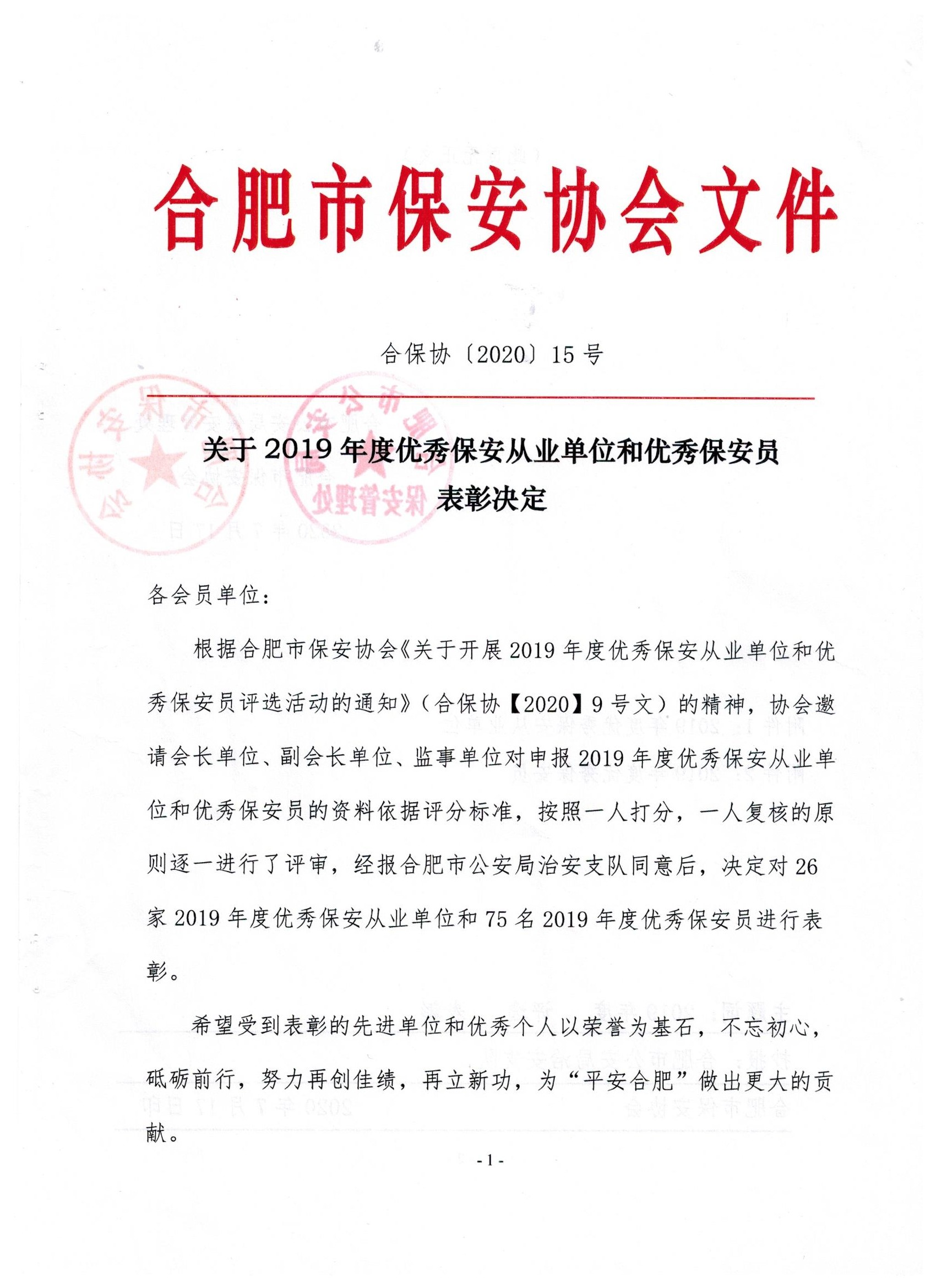乐发5002020年【15号文】关于2019年度优秀保安从业单位和优秀保安员表彰决定